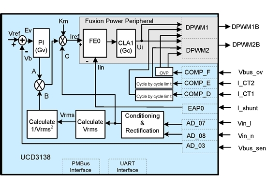 您可以看到固件外部仍有可使用示波器进行监控的模拟信号。另外,您是否注意到方框底部输出的信号?这些信号将进入 UCD3138 数字控制器并由固件处理,请看下图。