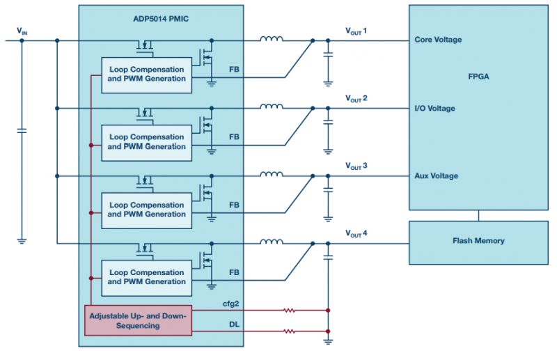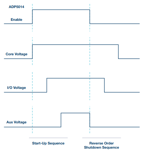 图2. ADP5014 PMIC 集成了对灵活控制上电/关断时序的支持。