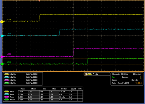 随这些设计一同提供的还有电路原理图、方框图、印刷电路板 (PCB) 文件和测试结果。这些测试使得设计人员能够评估他们正在尝试用于特定SoC的PMIC的性能,并且为他们提供可以在他们自己的设计中使用的示例设计文件。测试结果包括启动排序、负载瞬态、效率测试,以及图3中显示的其它内容。