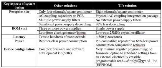 表1:TI的25G信号调节解决方案与其它解决方案间的比较