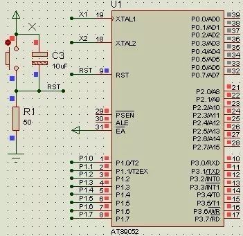 大家可以看到复位电路中电阻R1=10k时RST是高电平 ,而当R1=50时RST为低电平,很明显R1=10k时是错误的,单片机一直处在复位状态时根本无法工作。出现这样的原因是由于RST引脚内含三极管,即便在截止状态时也会有少量截止电流,当R取的非常大时,微弱的截止电流通过就产生了高电平。