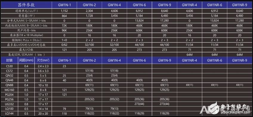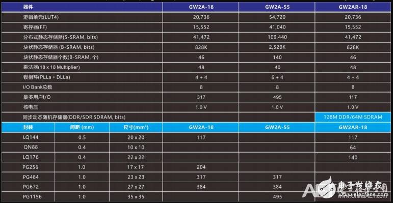 晨熙家族产品作为中密度FPGA典型代表,采用了成熟的55nm SRAM制造工艺,包括GW2A-55、GW2A-18、GW2AR-18三个型号和近十种封装,拥有不低于竞争对手的片上资源。其中,GW2AR-18中可以提供128M DDR/64M SDRAM同步动态随机存储器,与国外产品实现差异化优势。