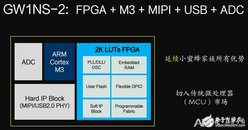 发布会现场重磅推出的GW1NS-2 SoC FPGA集成了Cortex-M3、MIPI、USB、ADC等组件,延续了小蜜蜂系列的优势,可以切入传统的MCU市场。加入USB 2.0的功能是GW1NS-2的创新之处,可运用于伺服电机控制器、Type C CD/PD、各种显示控制器/人机界面等。