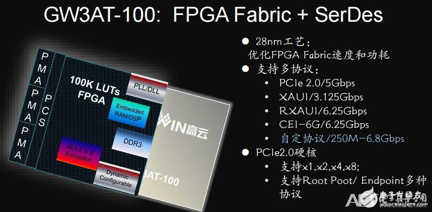 GW3AT-100采用台积电28nm工艺制造,优化了FPGA Fabric速度和功耗,支持PCIe 2.0/5Gbps、XAUI/3.125Gbps、RXAUI/6.25Gbps、CEI-6G/6.25Gbps和自定协议/250M-6.8Gbps等多种协议,另外还有支持x1、x2、x4、x8和Root Poot/ Endpoint多种协议的PCIe2.0硬核。