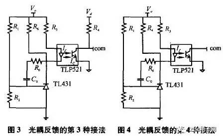 通常选择TL431结合TLP521进行反馈。这时,TL431的工作原理相当于一个内部基准为2.5V的电压误差放大器,所以在其1脚与3脚之间,要接补偿网络。常见的光耦反馈第1种接法,如图1所示。图中,Vo为输出电压,Vd为芯片的供电电压。com信号接芯片的误差放大器输出脚,或者把PWM芯片(如UC3525)的内部电压误差放大器接成同相放大器形式,com信号则接到其对应的同相端引脚。注意左边的地为输出电压地,右边的地为芯片供电电压地,两者之间用光耦隔离。图1所示接法的工作原理如下:当输出电压升高时,TL431的1脚(相当于电压误差放大器的反向输入端)电压上升,3脚(相当于电压误差放大器的输出脚)电压下降,光耦TLP521的原边电流If增大,光耦的另一端输出电流Ic增大,电阻R4上的电压降增大,com引脚电压下降,占空比减小,输出电压减小;反之,当输出电压降低时,调节过程类似。常见的第2种接法,如图2所示。与第1种接法不同的是,该接法中光耦的第4脚直接接到芯片的误差放大器输出端,而芯片内部的电压误差放大器必须接成同相端电位高于反相端电位的形式,利用运放的一种特性——当运放输出电流过大(超过运放电流输出能力)时,运放的输出电压值将下降,输出电流越大,输出电压下降越多。因此,采用这种接法的电路,一定要把PWM芯片的误差放大器的两个输入引脚接到固定电位上,且必须是同向端电位高于反向端电位,使误差放大器初始输出电压为高。