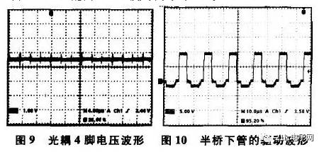 由图8可以看出,在If大于5mA时,Ic-Ta曲线基本上是互相平行的。根据上述分析,以下针对不同的典型接法,对比其特性以及适用范围。本研究以实际的隔离半桥辅助电源及反激式电源为例说明。第1种接法中,接到电压误差放大器输出端的电压是外部电压经电阻R4降压之后得到,不受电压误差放大器电流输出能力影响,光耦的工作点选取可以通过其外接电阻随意调节。按照前面的分析,令电流If的静态工作点值大约为10mA,对应的光耦工作温度在0~100℃变化,值在20~15mA之间。一般PWM芯片的三角波幅值大小不超过3V,由此选定电阻R4的大小为670Ω,并同时确定TL431的3脚电压的静态工作点值为12V,那么可以选定电阻R3的值为560Ω。电阻R1与R2的值容易选取,这里取为27k与4.7k。电阻R5与电容C1为PI补偿,这里取为3k与10nF。实验中,半桥辅助电源输出负载为控制板上的各类控制芯片,加上多路输出中各路的死负载,最后的实际功率大约为30w。实际测得的光耦4脚电压(此电压与芯片三角波相比较,从而决定驱动占空比)波形,如图9所示。对应的驱动信号波形,如图10所示。图10的驱动波形有负电压部分,是由于上、下管的驱动绕在一个驱动磁环上的缘故。可以看出,驱动信号的占空比比较大,大约为0.7。
