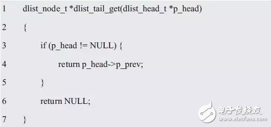 dlist_tail_get()函数用于得到链表的尾结点,在循环双向链表中,头结点的p_reev即指向了尾结点,详见程序清单3.35。