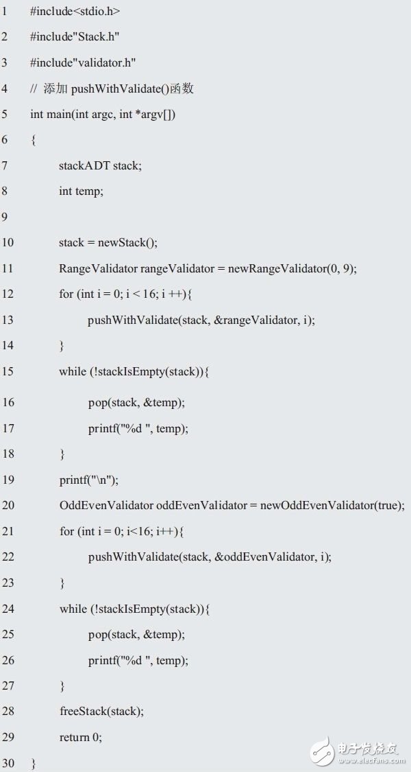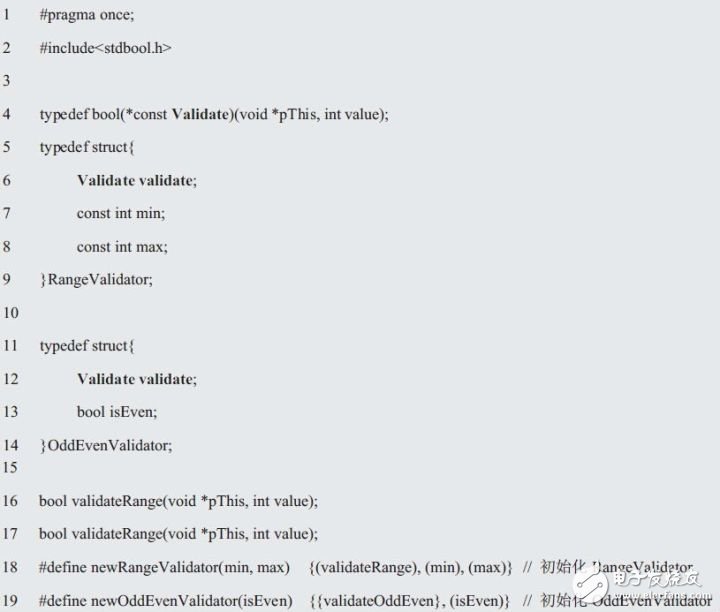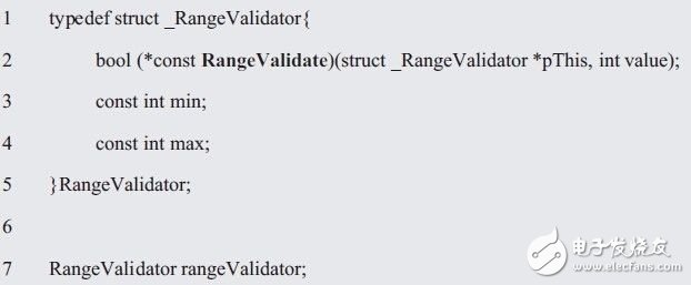 根据问题的描述,范围值校验器就是一个RangeValidator具体类,其属性是范围值校验参数min和max,其行为就是将符合范围要求的数值push到栈中。因此只要将RangeValidator的属性和行为作为成员封装到结构体中,就形成了RangeValidator类,这是面向过程编程的C程序员最容易想到,也最容易理解的方法。