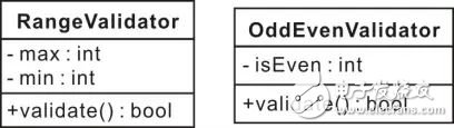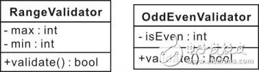 如图 4.2所示RangeValidator类有min和max属性,以及validate操作,min、max和validate都是RangeValidator的特征。特征是描述属性或操作的类属词汇,类似地OddEvenValidator有isEven属性和validate操作。