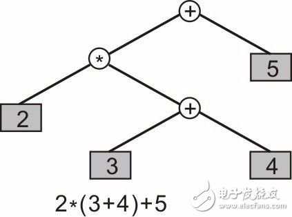 求解算术表达式就是一种二叉树,它的结点包含两种类型的对象:操作符和终值。操作符是拥有操作数的对象,终值是没有操作数的对象。表达式树背后的思想——存储在父结点中的是操作符,其操作数是由子结点延伸的子树组成的。操作数有可能是终值,或它们本身也可能是其它的表达式。表达式在子树中展开,终值驻留在叶子结点中,这种组织形式的好处是可以通过表达式将一个表达式转换为3种常见的表示形式:前缀、中缀和后缀,但中缀表达式是在数学中学到的最为熟悉的表达方式。在这里,将以2*(3+4)+5中缀表达式算术树结构为例。