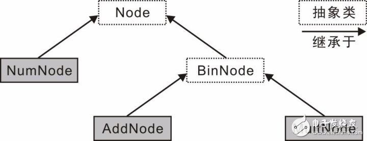如图 4.7所示展示了类的层次性,它们是一种“is-a”的抽象层次结构,子类AddNode和MultNode重新定义了BinNode和Node基类的结构和行为。基类代表了一般化的抽象,子类代表了特殊的抽象。虽然抽象类Node或BinNode不能实例化,只能作为其它类的父类,但NumNode、AddNode和MultNode子类是可以实例化的。Node抽象类的定义如下: