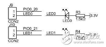 如图4.6 所示为AM824-Core 板载的2 个LED发光二极管,与MCU 的I/O 引脚通过J9 和J10 相连,其中的LED0 通过J9 与MCU 的PIO0_20 相连,LED1 通过J10 与MCU 的PIO0_21 相连。当I/O 输出低电平0 时,由于LED 阳极加了3.3V 电压(高电平1),因而形成了电位差,所以有电流流动,则LED 发光二极管导通,即LED 发光;当I/O 输出高电平1 时,由于无法形成电位差,则LED二极管不导通,即LED 熄灭。