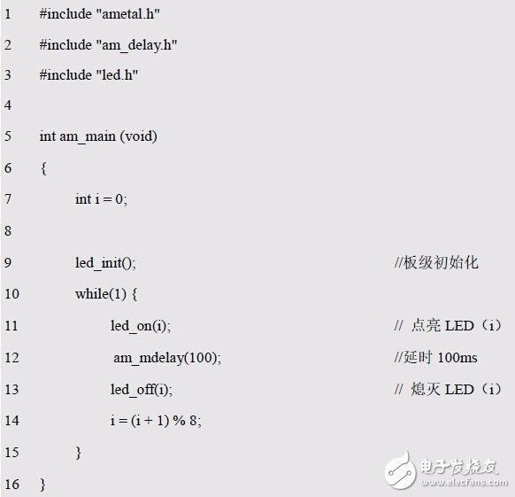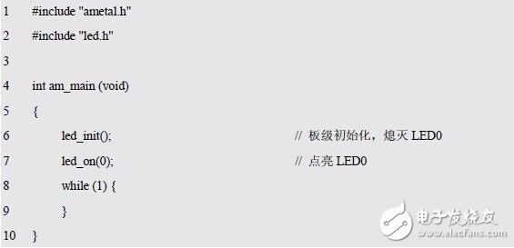 其中,led_id 是LED 的编号,AM824-Core 板载LED 的编号分别为0 和1。事实上程序设计的依赖倒置原则不一定要包含函数指针或抽象类型数据,当调用led_on()和led_off()点亮或熄灭LED 时,就使用了依赖倒置原则。它本来可以与I/O 的内存映射直接交互,却将直接访问抽象成了接口。那么针对接口的编程不妨就从点亮LED 开始,详见程序清单4.2。