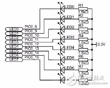MiniPort-LED 模块集成了8 个LED,均为低电平有效,分别通过PIO0_8~PIO0_15 控制,其中的R1~R8 为LED 的限流电阻,详见图4.7。