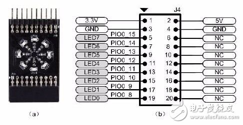 LED 模块通过MiniPort B(排母)与AM824-Core相连,同时将其余不使用的I/O 通过MiniPort A(排针)引出,实现模块的横向堆叠,其对应AM824-Core 的MiniPort 接口J4 的功能定义详见图4.8。