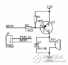如图4.9 所示为无源蜂鸣器电路原理图,只要短接J7_1 与J7_2,则蜂鸣器接入PIO0_24。当PIO0_24 输出低电平时,则三极管导通,向蜂鸣器供电;当PIO0_24 输出高电平时,则三极管截止,停止向蜂鸣器供电。因此只需要轮流切换PIO0_24 的电平状态,就可以控制蜂鸣器的“通电”和“断电”,即以一定的频率翻转PIO0_24 的输出电平。其实接通和断开“一段时间”的总和就是蜂鸣器的振荡周期,再稍作转换就能够得到确定的音频脉冲频率参数。从而产生机械振动音,只要频率在人耳听觉范围内,即可听到蜂鸣器发声。