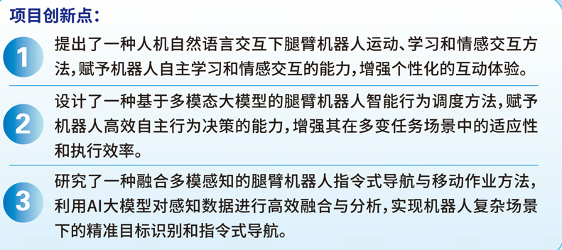 本项目聚焦腿臂机器人在多模态环境感知、自然语言交互和自主行为控制方面的技术瓶颈,基于RDK X3平台进行AI大模型算法开发,提出了一种融合AI大模型的创新性解决方案,提升腿臂机器人的综合性能。-