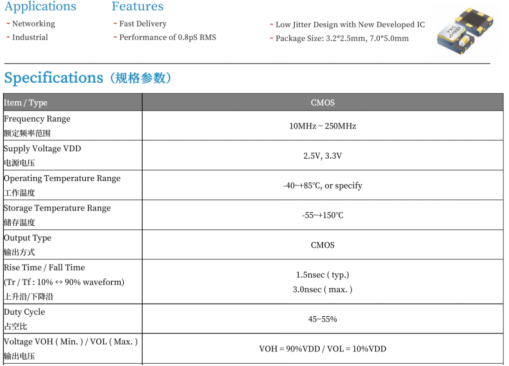 YSO511PJ为预编程TCXO。在-40~85℃的工作温度范围内,温度稳定性≤±2.5PPM、输出方式为CMOS。该产品可满足10~250MHz范围内任意频率定制,适用于特殊频率需求方案。