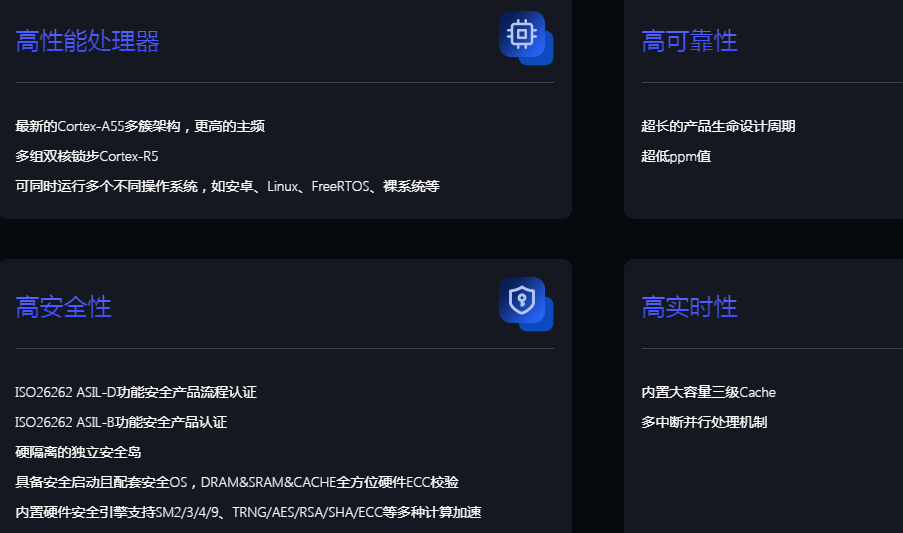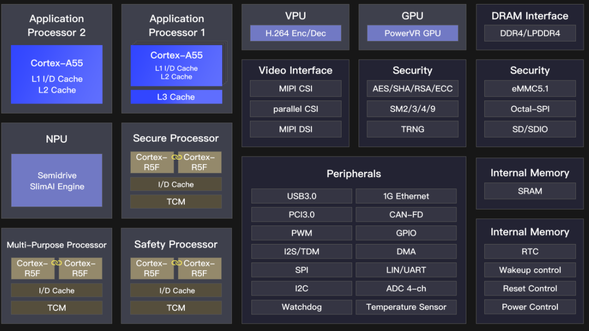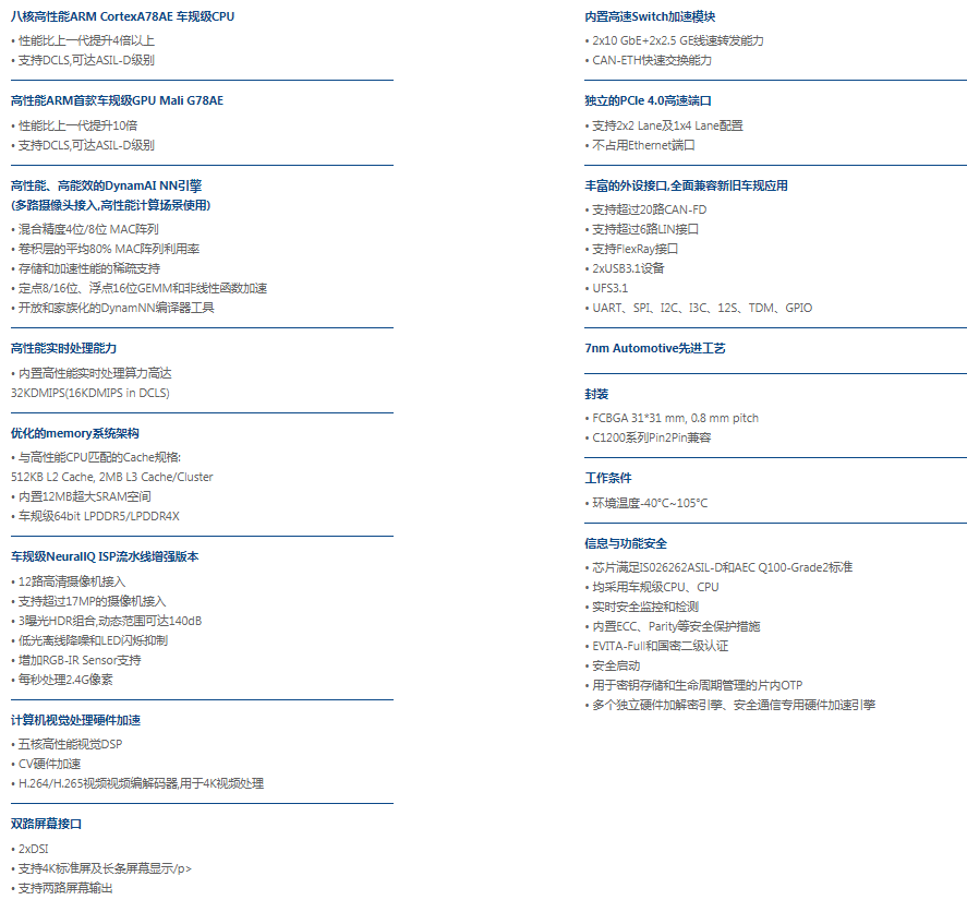 采用多核异构芯片架构,内置高性能的Cortex-A55 CPU内核及双核锁步的高实时高可靠Cortex R5内核;支持安全启动且配套安全OS,内置HSM支持TRNG、AES、RSA、SHA、SM2/3/4/9;内置了大容量三级Cache并支持多中断并行响应执行功能;集成了PCIe3.0/USB3.0/Ethernet TSN/SDIO3.0/CAN FD/Octal SPI/SPI/I2C/UART&LIN等丰富的外设接口。