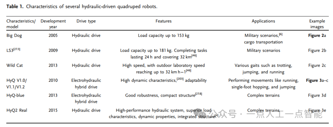 液压驱动的四足机器人由于其高功率密度,能够提供强大的驱动力和扭矩。这使得它们不仅能承载更重的负载,还能在复杂多变的地形中自由穿行。典型的液压驱动四足机器人有波士顿动力公司的大狗(BigDog)、LS3和 WildCat,以及意大利技术研究院(IIT)研发的HyQ系列电液混合驱动四足机器人。这些机器人的特性总结见表1。