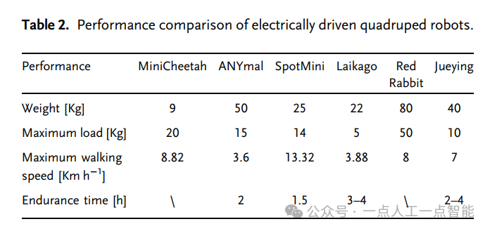 相较于液压驱动的四足机器人,电机驱动的四足机器人在尺寸、噪音水平和操控便利性方面具有明显优势。典型的电机驱动四足机器人包括麻省理工学院的MiniCheetah、苏黎世联邦理工学院的ANYmal和波士顿动力公司的SpotMini。此外,蔚蓝科技的Laikago以及浙江大学的“赤兔”和“绝影”,均展现了卓越的运动能力。这些四足机器人的性能参数如表2所示。