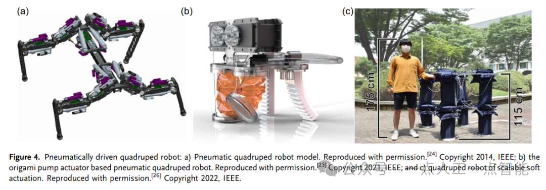 气动驱动的主要优势包括制造成本低廉、设计轻便且灵活性强。然而,它也存在控制精度较低的问题,难以实现高精度控制和低能耗。考虑到四足机器人应用场景的复杂性和对高动态响应及精度的要求,气动驱动的应用并未普及。气动驱动的四足机器人因阻抗较低,容易在行走时产生不必要的震动。