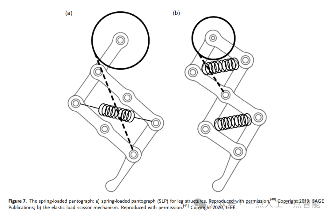 SLP机制不仅有效减轻了腿部的质量和惯性,但也因为膝关节的大范围伸展而增加了机器人的整体重量,这对机器人在复杂地形中的导航性能和抵抗地面干扰的能力产生了不利影响。为了提升四足机器人输出运动的效率,Nizami等人提出了一种改进版的SLP机制——弹性负载剪刀机制(见图7b)。这一新机制能够放大输入的角度变化,从而实现膝关节更大的输出位移,进一步优化了机器人的运动表现。