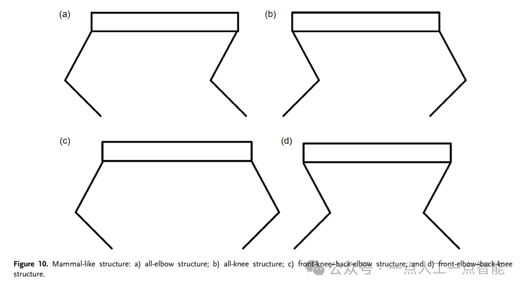 仿生四足哺乳动物型机器人不仅具备较大的工作空间和强大的避障能力,而且在速度和动态性能方面表现卓越。其腿部结构主要分布在垂直平面上,提供了强大的承载能力和对不同负载的适应性。因此,对于需要重载能力和快速移动的四足机器人来说,这种拓扑结构更为适合。常见的哺乳动物型行走腿拓扑结构包括四种主要类型:全肘关节型、全膝关节型、前膝后肘型以及前肘后膝型。