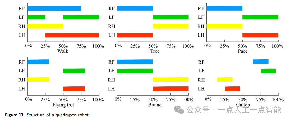 四足哺乳动物的四肢起落顺序遵循一种特定模式,称为步态。四足动物通过协调四肢动作展现出使用不同步态的能力,从而实现了更高的移动效率和在复杂地形中的出色适应性。借助仿生实验和步态分析,研究人员已经确定了四足机器人可以采用的多种步态。一般而言,步态可分为对称步态(如行走、小跑和跑步)和不对称步态(如跳跃、腾跃和奔跑)。不同步态的相位关系图见图11。