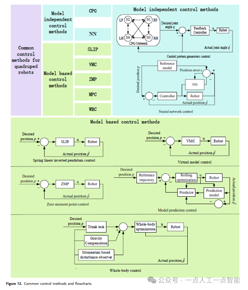 运动控制指的是通过复杂算法调控机器人在动态运动过程中的位置和关节扭矩,旨在实现动态稳定并提高系统的整体鲁棒性。与传统固定基座的机器人不同,四足机器人在控制运动速度和姿态稳定性时,极大地依赖于脚与地面的相互作用。因此,在考虑机器人自身动力学特性的基础上,四足机器人的控制还需特别关注脚与地面的接触状况,包括接触反力和摩擦力的影响。四足机器人的运动控制策略主要分为两大类:基于模型的控制方法和非基于模型的控制方法。常用的控制方法如图12所示。