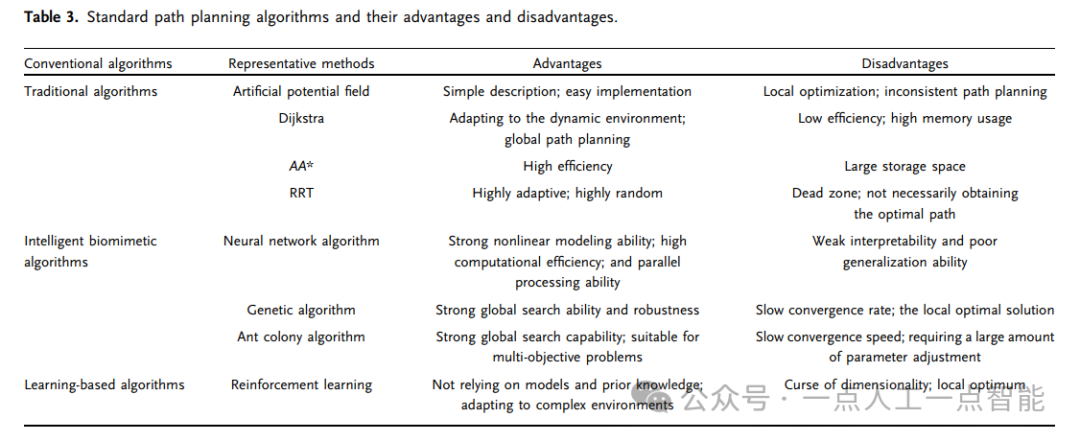 路径规划是机器人从起始点到达目的地的基本策略,同时要避开环境中的静态和动态障碍物。根据路径规划方法的不同特点,可以将它们分为传统路径规划方法、智能仿生路径规划方法以及基于学习的路径规划方法。具体路径规划方法及其各自的优缺点见表3。