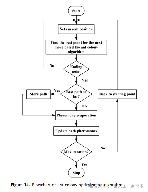 蚁群算法灵感来源于蚂蚁觅食行为。即使不知晓食物的具体位置,蚂蚁也能找到从巢穴到食物源的高效路径。这一算法已在多个科学与工程领域得到应用,包括车间调度、旅行商问题以及图像着色等。此外,它也被广泛应用于机器人导航问题中,以实现避障和高效的路径规划。图14展示了其优化过程。