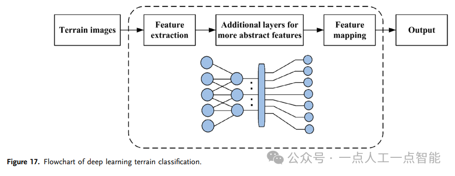 结构化视觉特征算法包括特征提取与分类两部分,使用分类器完成任务。然而,因为识别过程是由离散步骤组成的,所以难以实现端到端的训练。这一限制妨碍了算法参数的全局反向传播,使得参数更新变得更加困难,进而导致算法训练复杂,影响了优化效果。同时,分类器的设计往往需要人类专家的介入,这种依赖人为因素的情况削弱了地形识别的效率与精确度。相比之下,卷积神经网络(CNN)是一种模拟人类大脑神经网络的生物启发式模型,它能模拟大脑处理视觉信息的方式,即通过多层的感受野。借助多层卷积网络结构,CNN可以逐步提取图像的颜色、结构和纹理等结构化视觉特征。在各层之间的卷积过程中,这些特征相互交织并整合,最终生成带有语义信息的抽象视觉特征。深度学习(DL)驱动的地形识别算法主要依靠CNN来提取此类抽象特征,并通过诸如全连接层这样的分类器将其转化为可识别的标签。这种方法实现了从传感器获取特征到网络内部的端到端处理,采用端到端的方法后,在输出端就能直接得到结果,不再需要单独设计特征或挑选分类器。具体流程请参见图17。例如,Abou-Nasr等人提出了一种基于递归神经网络的灰度图像地形识别方案,用以区分草地、树木以及道路上的落叶。当图像像素从顶部到底部被扫描时,分类器会识别出相应的地形类型。而Liu等人则提出了一种基于深度稀疏过滤网络(DSFN)的地形识别方法,该网络能够自动从未加工的数据中学习特征,这是一种突破性的深度学习技术,仅需在预训练和微调阶段调整少数参数,区别于传统的深度网络。另外,Borijindakul等人开发了一种递归神经网络,用于分类软质地形,以此扩大四足机器人的活动范围,该方法成功地区分了六类不同的地形。