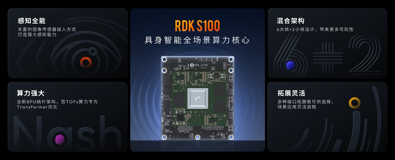 RDK S100是面向具身智能前沿创新与应用突破的全场景算力核心,基于新一代BPU纳什架构设计,拥有百TOPs级算力,专为大参数Transformer优化,可以满足人形机器人、仿生机器人等具身智能应用场景对感知精度和泛化能力的高阶需求。RDK S100还提供丰富的图像传感器接入方式和多种接口拓展板,为具身智能机器人的开发提供灵活拓展性。