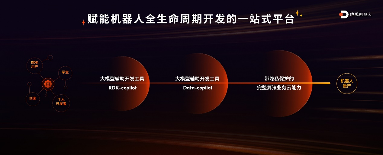 地瓜机器人全链路开发平台将全面支持RDK X5和RDK S100,赋能机器人开发的全生命周期。全新的Cloud云端开发环境带来了行业内首个基于大模型的机器人设计开发助手RDK-Copilot,可辅助进行代码补全,并提供高效智能的问答助手;Data-Copilot可帮助客户实现高效的数据处理和利用,克服样本数量不足和样本获取难度大的挑战。