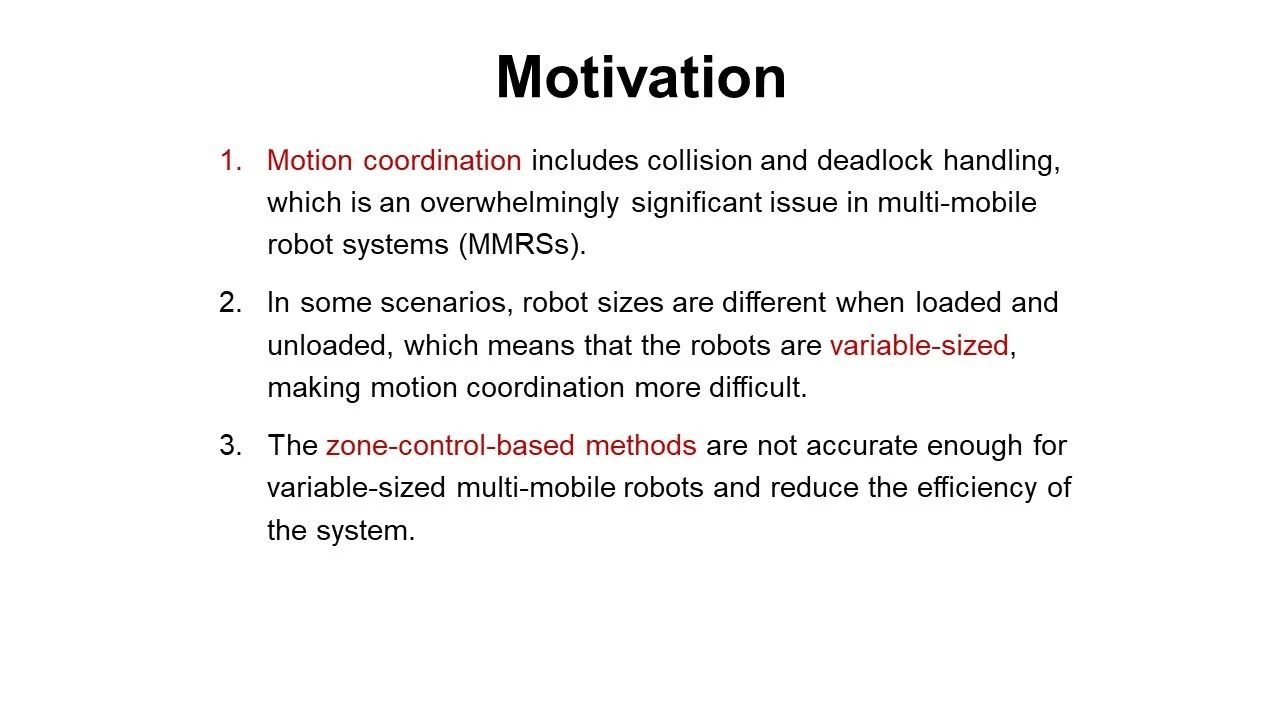 中文摘要:多移动机器人系统(MMRS)广泛用于制造业和仓储等工业场景的运输。在MMRS中,碰撞和死锁可能导致财产损失或系统停滞,因此运动协同十分重要。然而,在一些场景中,机器人尺寸在载货和未载货时是不同的,即机器人尺寸是变化的,这使得运动协同更具挑战性。