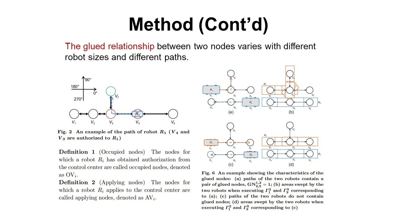 基于区域控制的方法首先需要将环境划分为不相交区域,然后通过区域的分配静态或动态地进行运动协同。但是,这种基于区域控制的方法对于变尺寸机器人不够精确,降低系统效率。因此,提出一种基于粘连节点的运动协调方法,可基于路线图和机器人实时路径动态避免碰撞和死锁。粘连节点的动态特性使该方法不必对环境分区即可适用于各种场景。