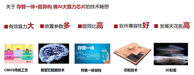 基于存算一体超异构概念,亿铸科技提出了自己的技术畅想:若能把新型忆阻器技术(RRAM)、存算一体架构、芯粒技术(Chiplet)、3D封装等技术结合,将会实现更大的有效算力、放置更多的参数、实现更高的能效比、更好的软件兼容性、从而突破性能瓶颈,抬高AI大算力芯片的发展天花板。