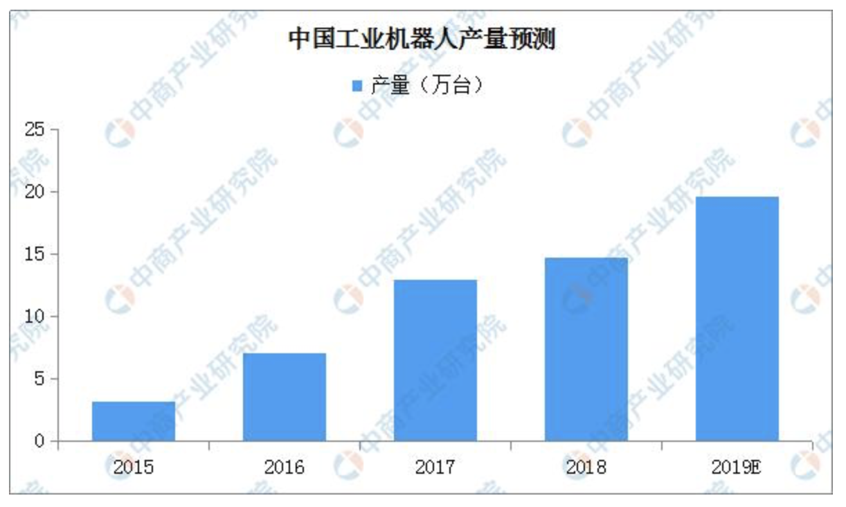 我国是工业机器人应用大国,行业迅猛发展,产量持续增长。2015年产量仅32996台。2017年突破13万台,提前三年实现了10万台产量的目标。2018年全国工业机器人产量为147682台,同比增长4.6%。预计2019年工业机器人产量将近20万台。