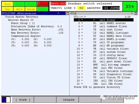 iRCalibration的界面进入首先按MENU键,选择UTILITIES,按F1[TYPE],选择iRCalibration。然后选择Vision Master Recovering。
