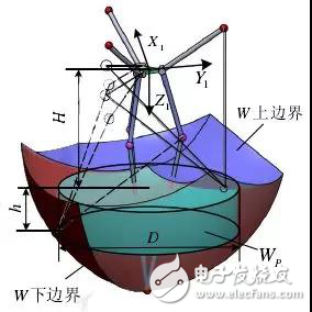 以并联机器人为例,全工作空间是给定所有位姿时机器人末端可达点的集合,可利用圆弧相交的方法获得,其形状为一个似伞形的三维空间,图标为W