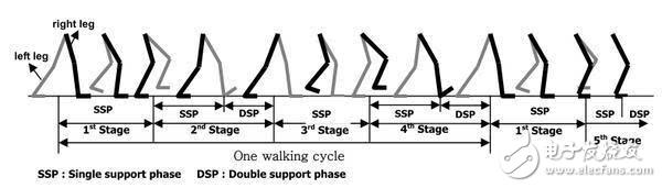由于复杂地形的双足平衡无法由单一的控制器实现,所以多个控制器的切换策略被用于解决平衡问题。在这一个策略中,机器人的行走被设定为一个周期(cycle)每一个周期被分成了不同的行走阶段(stage),如下图所示: