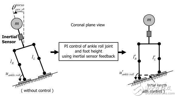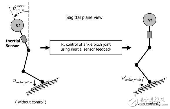 对于机器人的俯仰姿态控制,在规定的踝关节轨迹上,直立姿态控制器附加了含有俯仰误差的 PI 控制器: