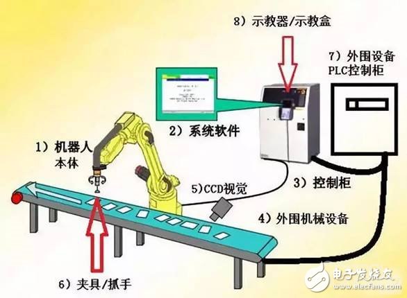 工业机器人由3大部分6个子系统组成。3大部分是机械部分、传感部分和控制部分。6个子系统可分为机械结构系统、驱动系统、感知系统、机器人-环境交互系统、人机交互系统和控制系统。