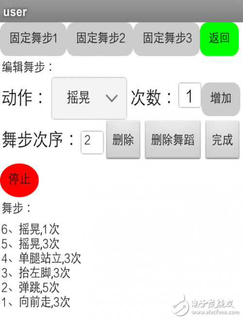 使用者可以下达不同的动作指令(如运动方向、运动形态等),来完成对机器人的动作控制。并且可以通过下达其他指令(如背景颜色、音乐播放),来完成更为复杂的控制。图3为设计舞步界面,用户能设计一套属于自己的舞蹈动作。我们还设置了3套固定的动作,供用户调用。
