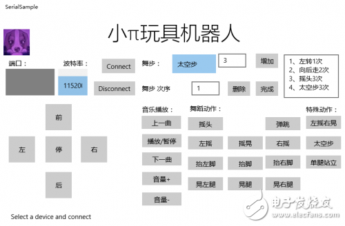Win10 IoT是微软开发的一款基于win10的物联网操作系统。在装有win10 IoT系统的平板电脑中可以直接运行小π机器人的平板端程序。平板端程序功能和手机APP程序类似,可以通过蓝牙对小π机器人进行相应的控制。程序是通过C#编写的,程序界面如下图所示。