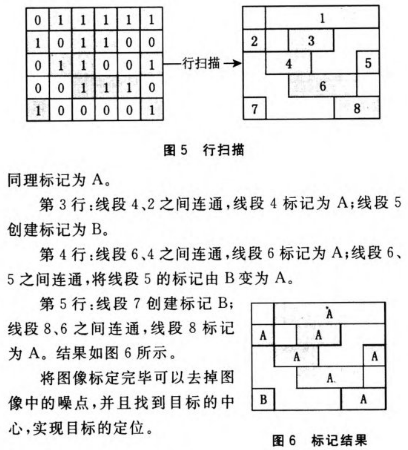 首先对二值图像进行行扫描得到线段连通标记,如图5所示。然后检查每行之间线段与上一行线段之间的连通关系,并更改标记。