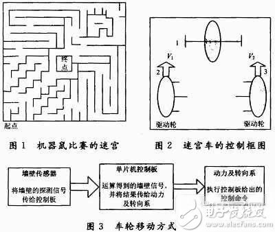 迷宫车采用轮式移动方式。优点是:结构和控制简单而且技术成熟。从选定电动机转速和轮胎直径,可以简单地计算出小车的速度。但是,有关路面的阻力或上坡的驱动转矩等成为重要的因素。考虑这点,在轮胎上使用无线遥控车的塑胶轮胎。如图3所示,前轮1为万向脚轮或球形轮,后轮2和后轮3为独立驱动轮,利用它们的转速差实现转向。这种组合的特点是机枢组合容易,而且当2个驱动轮以相同速度、相反方向转动时车体能绕2个驱动轮连线的中点自转,值得注意的是自转中心与车体中心不一致。