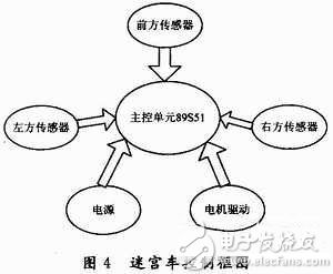 迷宫车由墙壁传感器、单片机控制板、动力及转向系组成的,控制框图如图2所示。