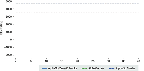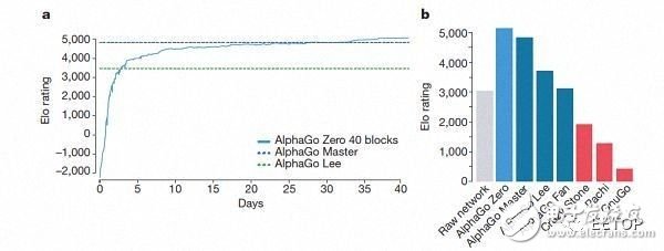 AlphaGo Zero从0开始的学习曲线,这个版本的神经网络由40个模块组成。